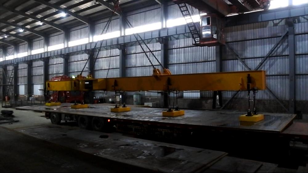 電永磁鐵聯用。對于中厚板(6mm~32mm)電磁鐵的間距多取3~4米,兩端外伸部分的長度可取間距的二分之一。根據吊運張數的不同,又分為350型與400型兩類。350型適合于中厚板廠、造船廠、機械制造廠,采用調磁控制方式,能起吊一張或一定張數鋼板。400型適用一次搬運盡量多的張數,可根據用戶要求另行設計制造吊運700℃以下鋼板用高溫型產品。